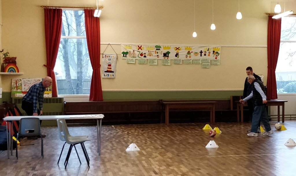 At MATIES, our new men’s group aimed at men living on their own, we have been playing Walking Football. This photo, although not very a good one, shows 89 year old Alan just before scoring a goal.